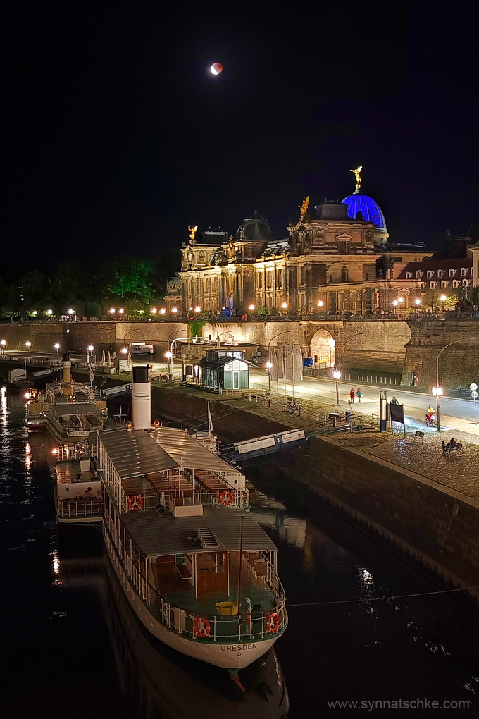 Eine ringförmige und totale Sonnenfinsternis sowie Polarlichter in Island, im Flugzeug, in Südeuropa und in den Badlands von New Mexico, all das haben Steffen und ich teils sogar schon mehrfach erlebt, aber einen Blutmond – an sich ja viel banaler – hatten wir tatsächlich noch nie gesehen. Heute haben wir uns daher mal aufgerafft, das Stativ geschnappt und sind kurz vor Sonnenuntergang der Elbe entlang in Richtung Dresdner Altstadt spaziert. An der Marienbrücke hatten sich schon einige Zuschauer positioniert, darunter auch Freunde, aber wir sind noch weiter. Ich wollte einfach möglichst nahe an die Brühlsche Terrasse ran, weil der Mond ja hinter der Stadtsilhouette aufs Foto sollte.