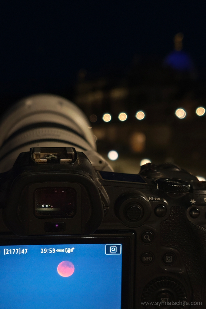 Der erste Teil des Naturschauspiels, als der Mond langsam in den Halbschatten der Erde eintrat, konnte nur weiter östlich in Asien beobachtet werden, in Deutschland war es da noch taghell. Und zu Beginn der totalen Mondfinsternis um 19:31 Uhr ging in Dresden gerade erst die Sonne unter. Erstmals wahrgenommen haben wir den schon komplett abgedunkelten Mond so gegen 20:15 Uhr. Im Vorfeld hieß es, dass man ihn eventuell gar nicht ordentlich sieht und dass er diesmal nicht so rot werden würde. Steffen hatte mir die aufmunternden Zeilen noch beim Warten auf der Augustusbrücke aus der Zeitung vorgelesen. Zum Glück traf das nicht zu! Zumindest ich fand diese rote Färbung des Mondes schon sehr faszinierend! Und sehr anders als gestern, als er richtig hell und riesengroß im rosaroten Abendlicht über dem Bergener See aufging (leider ohne Wolfssichtung… ;-( ).